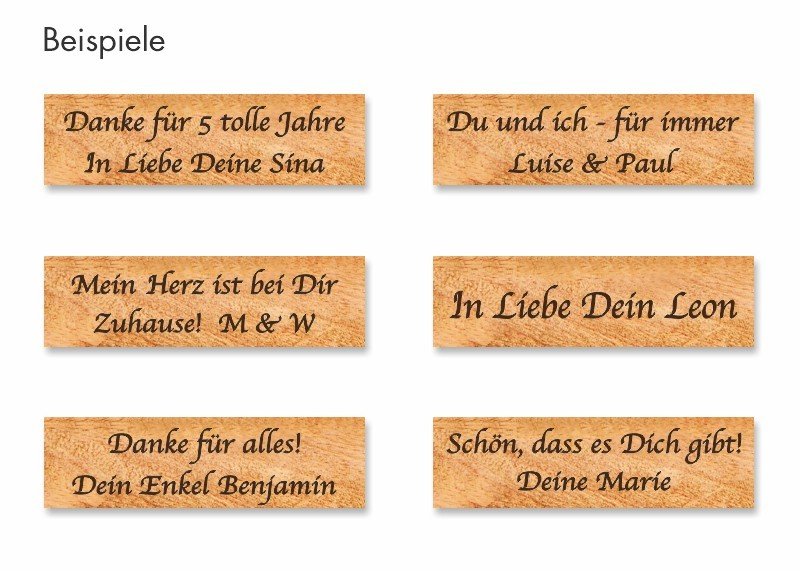 Für Ihre Wunschtext-Gravur auf dem Mangoholz-Sockel haben Sie maximal 2 Zeilen mit jeweils 25 Zeichen zur Verfügung. Bei 2-zeiliger Gravur wird der Text etwas kleiner als bei einer 1-zeiligen Gravur. In das Metall-Herz gravieren wir gerne ein Datum für Sie ein.