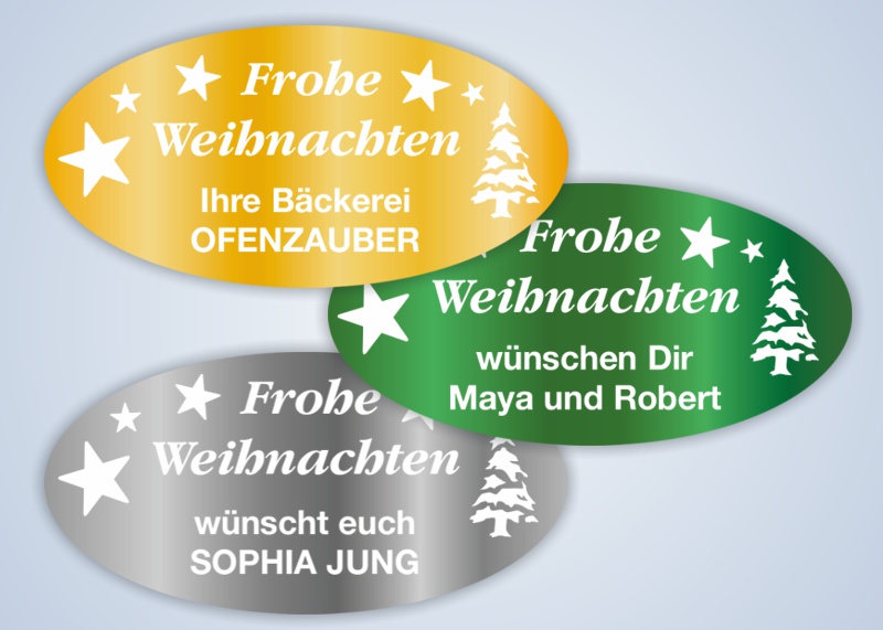 Mit unseren OVAL-COLOR Weihnachtsetiketten in 3 glänzenden Metallic-Farben geben Sie jedem verpackten Geschenk eine persönliche, edle Note.